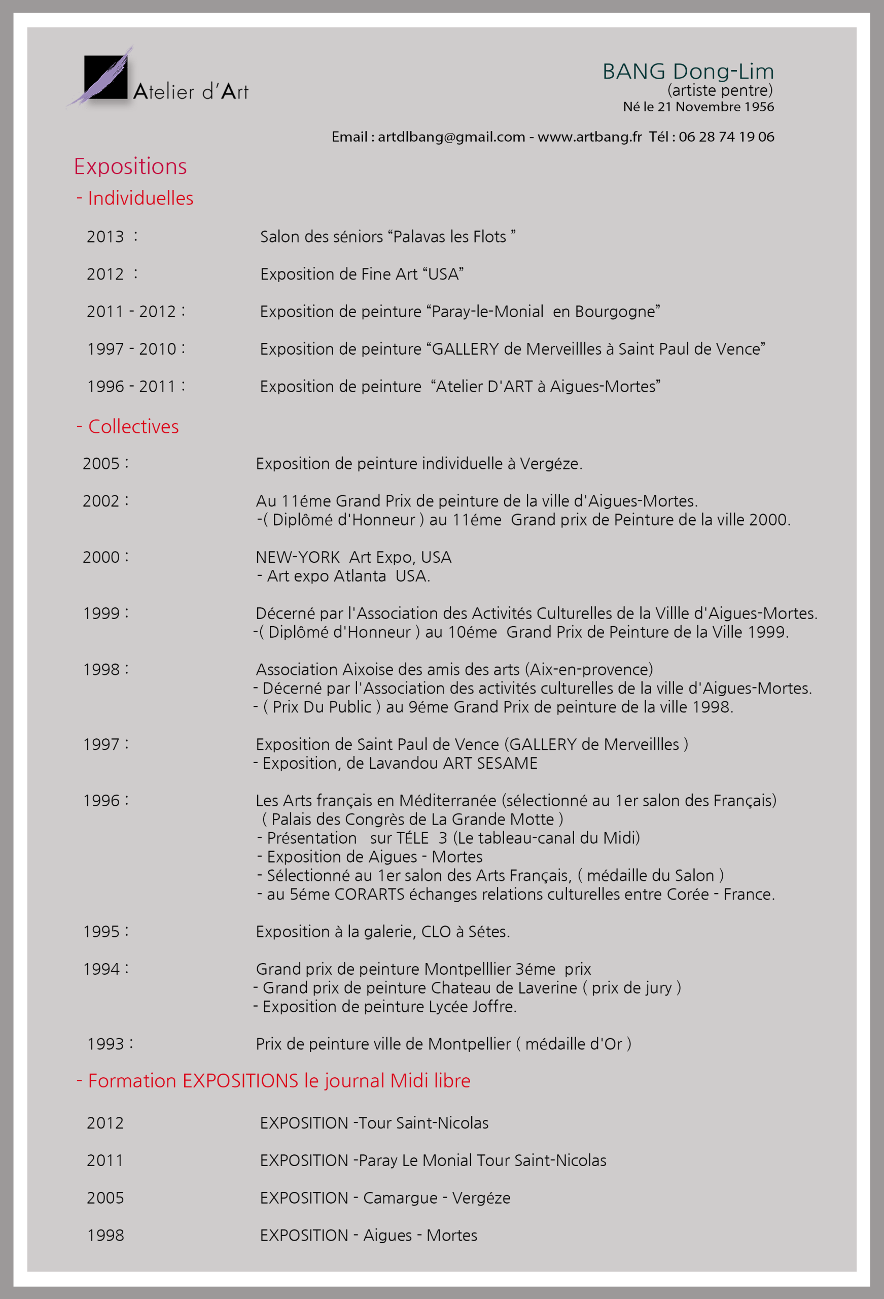 BANG Dong-Lim est un artiste peintre chevronné fort de plus de 40 ans d’expérience. Fasciné par la beauté des paysages du sud de la France au début des années 90, il a su se faire reconnaître sur la scène artistique européenne, notamment à Montpellier et Aigues-Mortes.