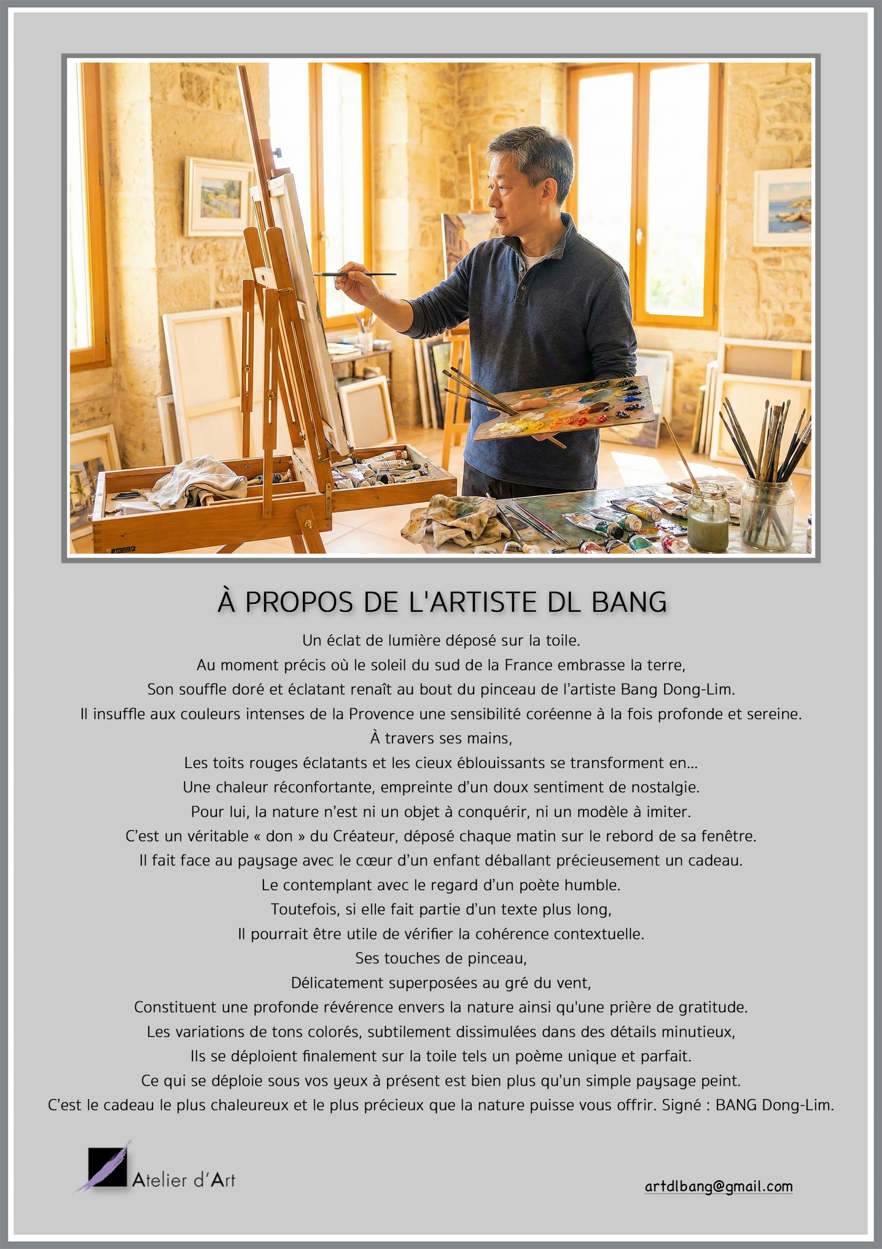 À propos de l’artiste : BANG Dong-Lim Artiste sud-coréen passionné par les paysages et les couleurs chaleureuses du sud de la France. BANG Dong-Lim puise son inspiration à la source même de la Nature, la traduisant comme un poème offert pour en exprimer toute l’émotion. Son talent s’exprime à travers un respect profond pour cette nature généreuse, soutenu par une technique classique d’une grande précision. Chaque tableau, traité avec un souci extrême du détail, est une invitation au voyage à travers les villes et les paysages de Provence. Par la délicatesse de ses touches et la richesse de ses tonalités, il place la nature directement sous vos yeux.